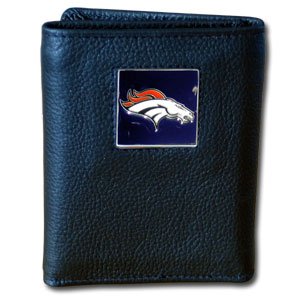 Our Executive Trifolds are made of high quality fine grain leather with a sculpted pewter NFL team emblem. Packaged in window box that can be hung by a peg or stacked on a shelf..