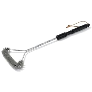 Product Description : Amazon.com Product Description : Designed to nose into grill grate corners, between rods, and along the cooking surface edges, Weber's 6424 21-Inch T-Brush features a 360-degree wrap of stainless-steel bristles that are long-wearing and hard-working but also safe to use on porcelain enamel. The extended handle makes it easy to get to the back of the grate, and the black resin handle covering is both comfortable and attractive. A rawhide hanging strap makes it easy to stow the brush right near the action. Product Description : Easily cleans hard to reach spots between the cooking grate rods and in tight spaces at the edges of the cooking grate. Bristles are long-wearing and will not scratch porcelain enamel.